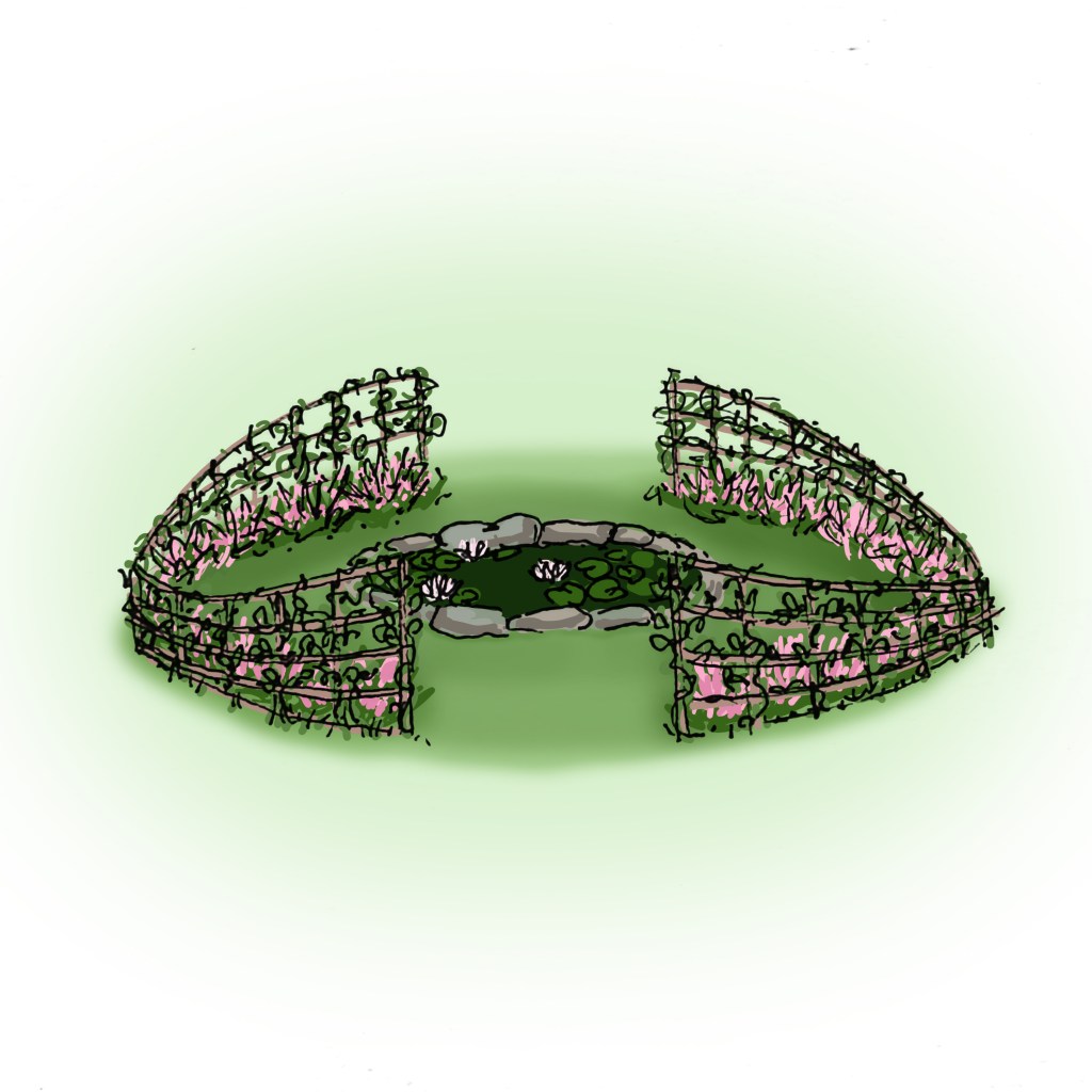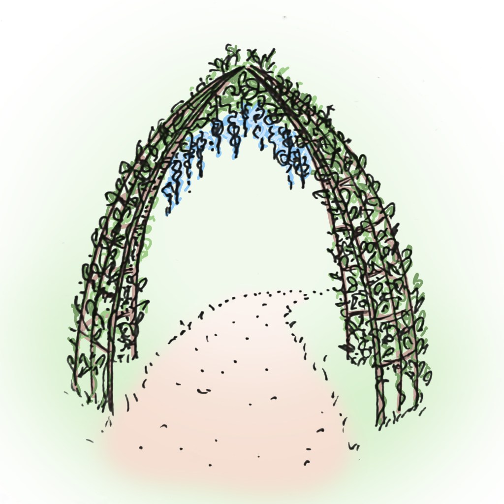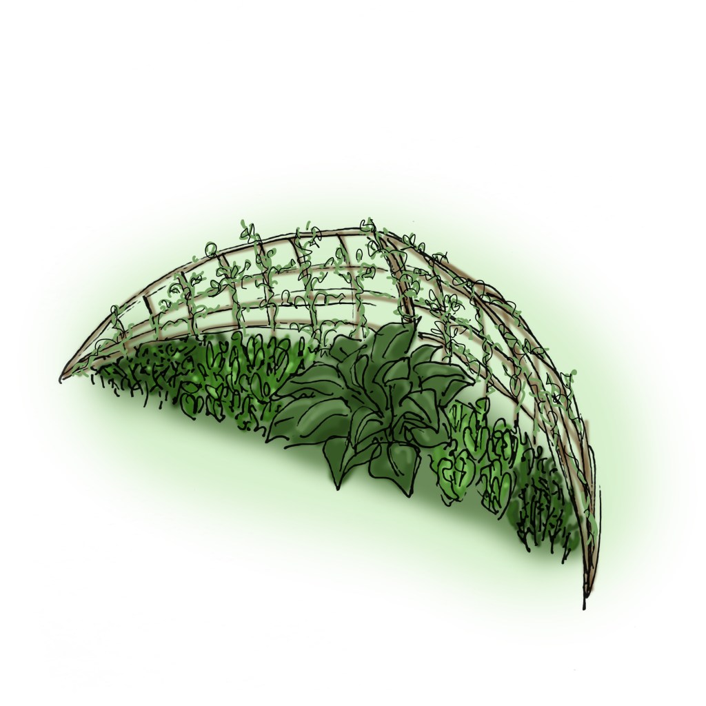 Forestil dig et grønt, skyggefuldt lysthus med dine yndlingsplanter: roser, vin, minikiwi, brombær, bønner, græskar, tomater, spinat, agurker og meget mere!