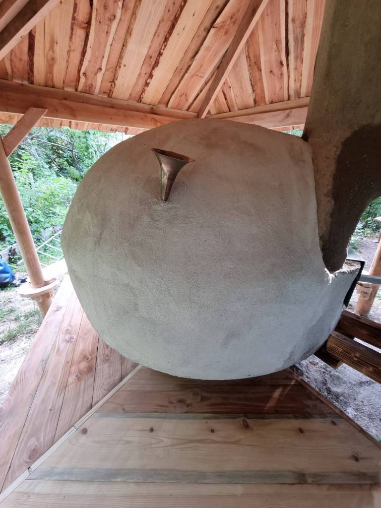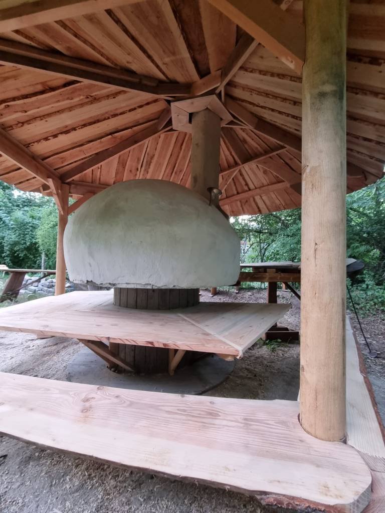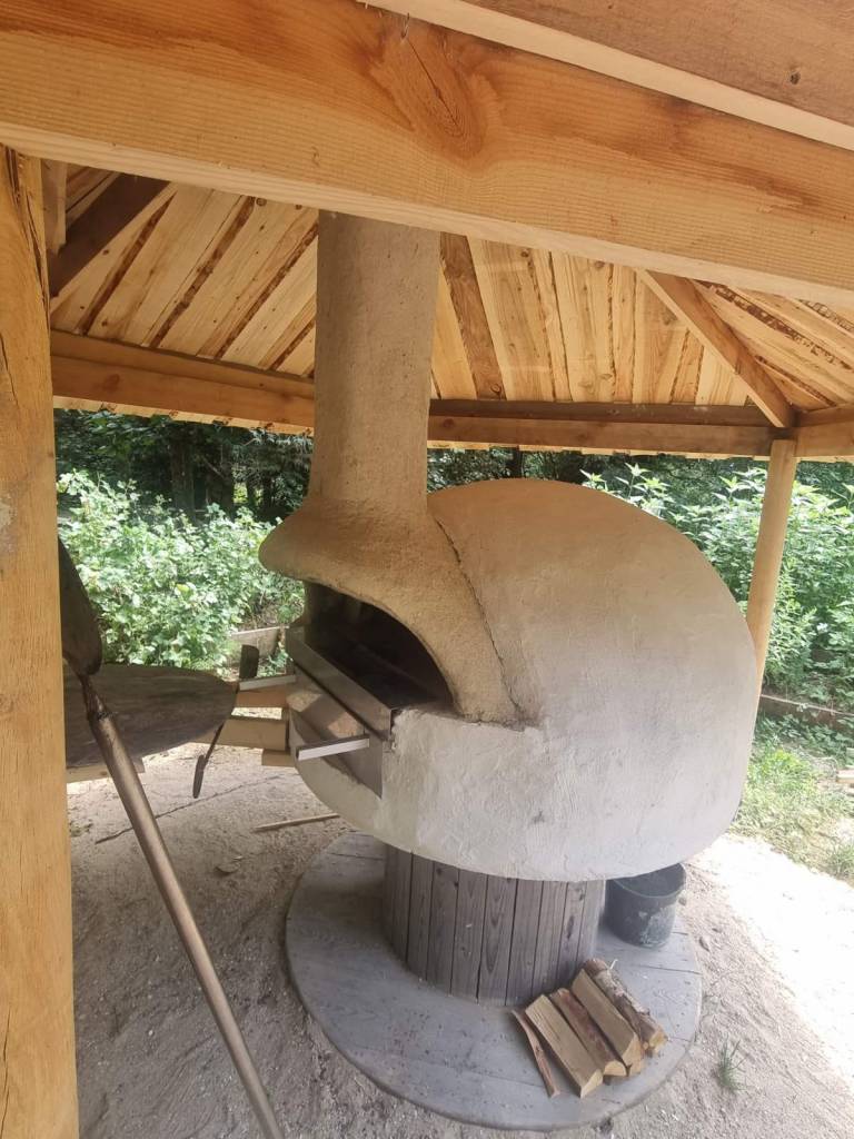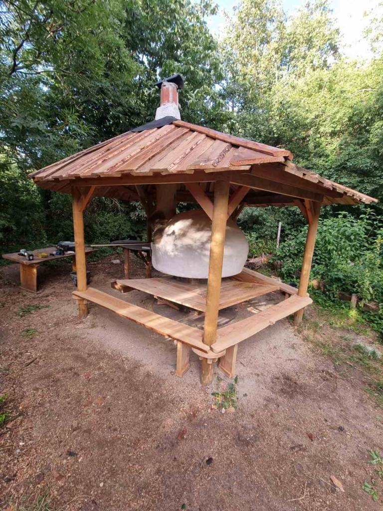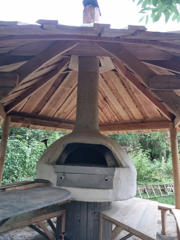 Pizzapavillon til Naturværkstedet Kløvemarken, København. Bygget i høj grad af genanvendelige materialer. 120 cm stor Ovnen sidder på en aflagt kabeltromle. Ovnen har en indbygget dampkasse og kan således bruges til brødbagning. God isolering hele vejen rundt gør at ovnen holder temperatur i 3-4 dage. Der bygget et bord i børnehøjde rundt om tromlen, så børn fra 3 til seks år kan stå og lave deres egen pizza. Bænke sidder på læderhængsler rundt om egestolpe, hvilket tillader deres frie bevægelighed og bedre adgang for børnene til ovnen. Indbygget askeopsamling tillader hurtig og nem rensning af ovnen ifm. bagning af brød.